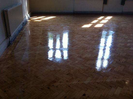 Gronant Institute Picture 9 Showing the pitch pine parquet block fully restored view of the main hall from the stage just after the last coat of lacquer has been applied...doesn't it look good.