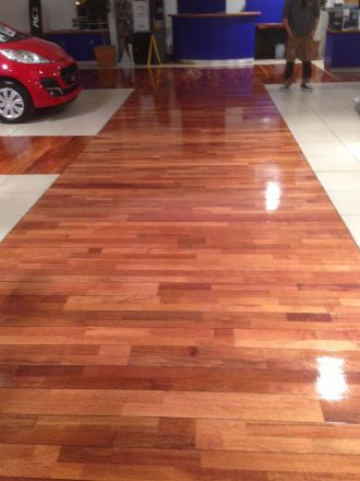 Our clients wanted easier maintenance of their Junckers Merbau flooring, which covered just over 100m2 of the showroom floor, we recommended a commercial 4 coat lacquer system, using a primer coat and then a 3 further coats of the rather splendid Bona Traffic HD, which would make sure the wood surface is fully protected with a high quality, long lasting, durable finish.