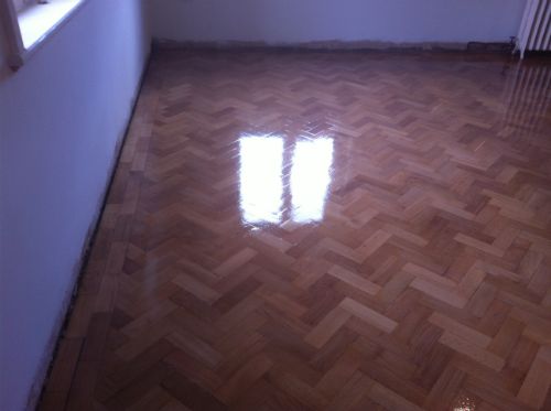 Parquet Wood Block Floor Sanded, Sealed and Restored in ChesterThe last of 3 coats of lacquer had just been applied to this lovely original oak parquet floor...looking good.